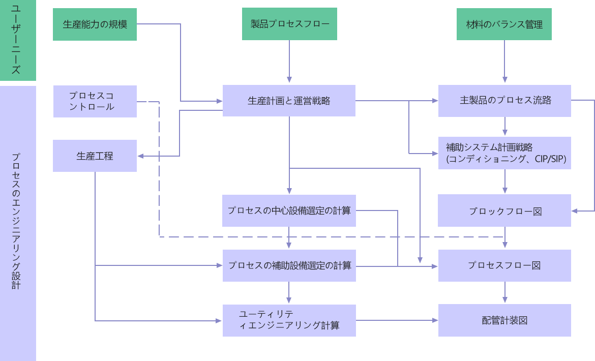 お客様のURS(ユーザー要求仕様書)に基づき、生産プロセス、生産能力計算、ユニット操作を含むプロセスフロー図(PFD)を設計します。PFD完成後、P&ID設計に進み、プロセス、計装、ユーティリティの詳細、およびプロセスシステムで使用されるプロセス設備とユーティリティの技術仕様を提供します。設計プロセス全体を通じて、設計がURSの要求を満たしていることを確認するため、複数回のレビューを実施します。