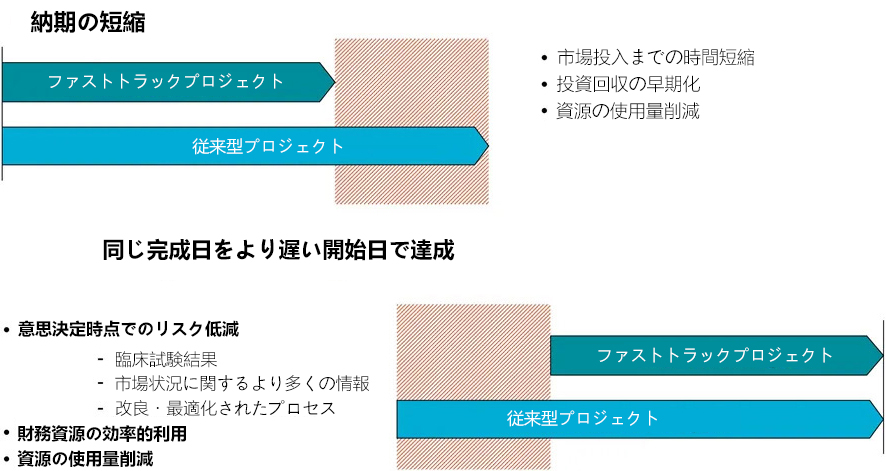 モジュールの短納期の特性を活かし、製造の開始を遅らせることができ、プロセス開発に十分な時間を確保することで、プロセス変更による、手直しを避けつつ、市場需要と投資回収を両立することが可能です。