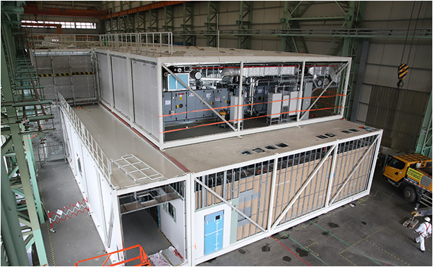 壁が取り付けられた後、扉、窓、天井が設置されます。プロセス設備やユーティリティ設備も設置されるため、工場内でシステムの試運転が可能です。