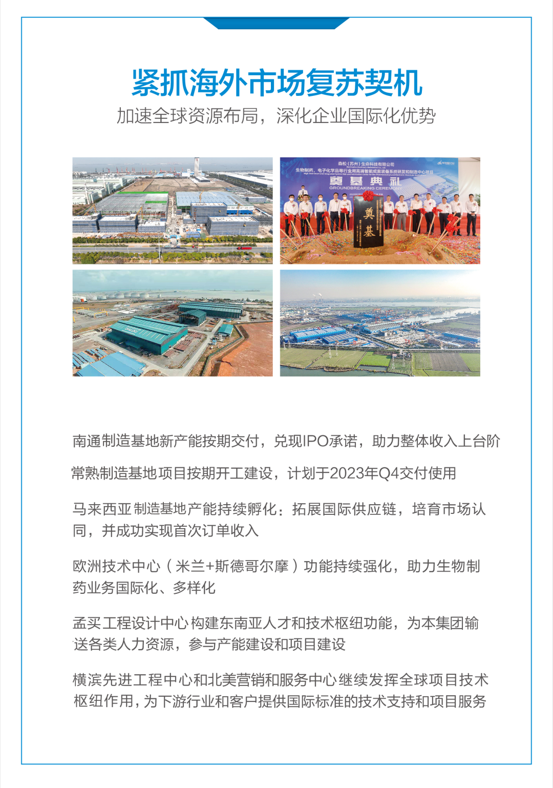 作为掌握核心工艺技术、模块化建造及数智化工厂技术的跨国企业,森松生命科技致力于满足全球制药、生物制药、医美、快消、数据中心等行业和领域对生产装备的需求。公司通过不断创新和优化,助力国内企业加速实现核心和高端装备的国产替代战略布局,推动行业发展。同时,公司积极拓展海外市场,深化“全球化”业务开拓战略,为全球生命科学及相关行业贡献森松力量。