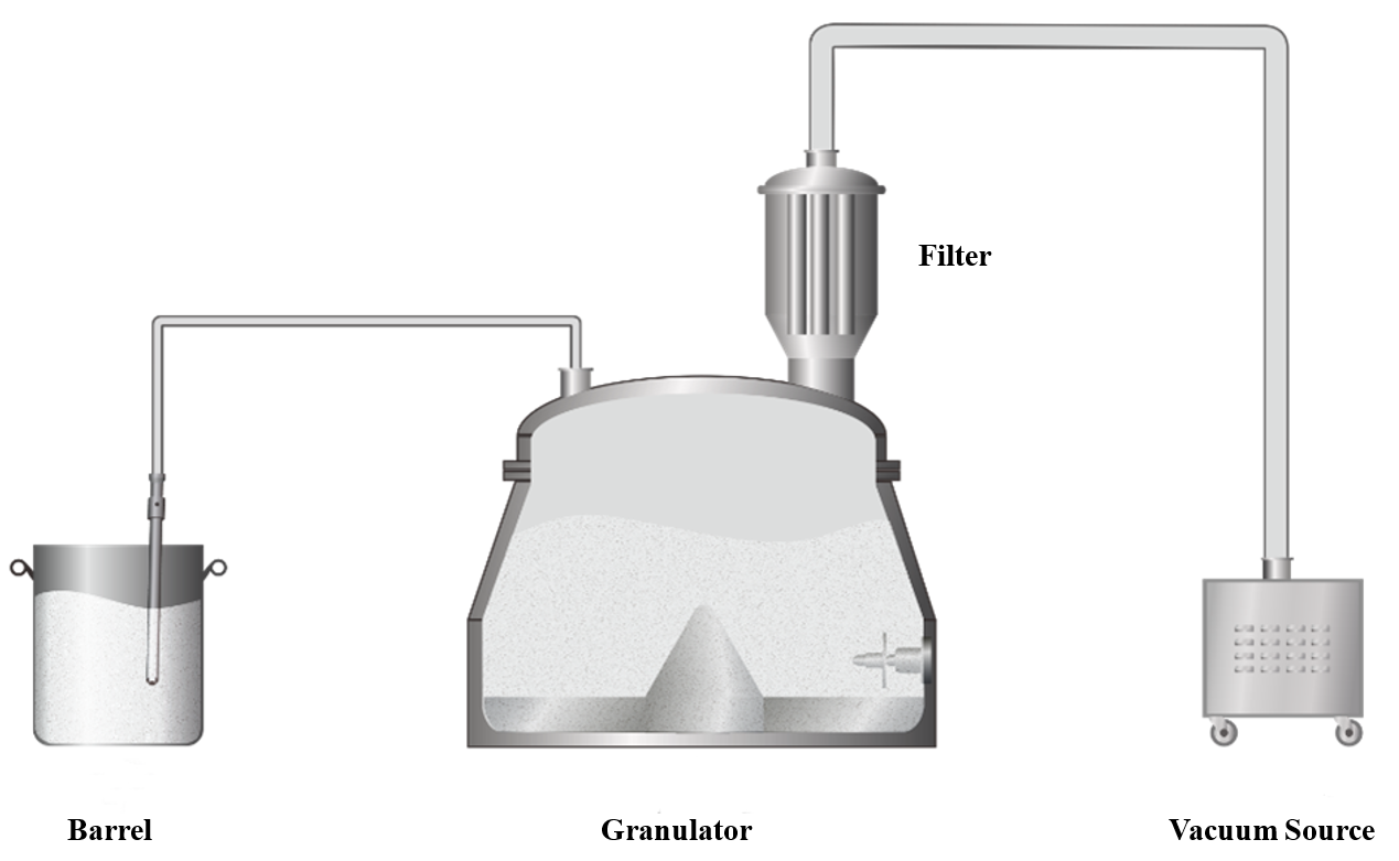 For feeding 100 kg of raw materials, vacuum feeding is an effective way to minimize manual labor. To boost feeding efficiency, it’s crucial to streamline the process, increase the material transfer rate, and reduce leaks in the vacuum system. We recommend using the granulation pot directly as the feed bin, as illustrated below. By employing a high-efficiency vacuum source and selecting multi-layered, folded filter materials, you can significantly reduce pressure loss. Additionally, reinforcing the pot’s seal will enhance the vacuum system’s ability to maintain negative pressure.