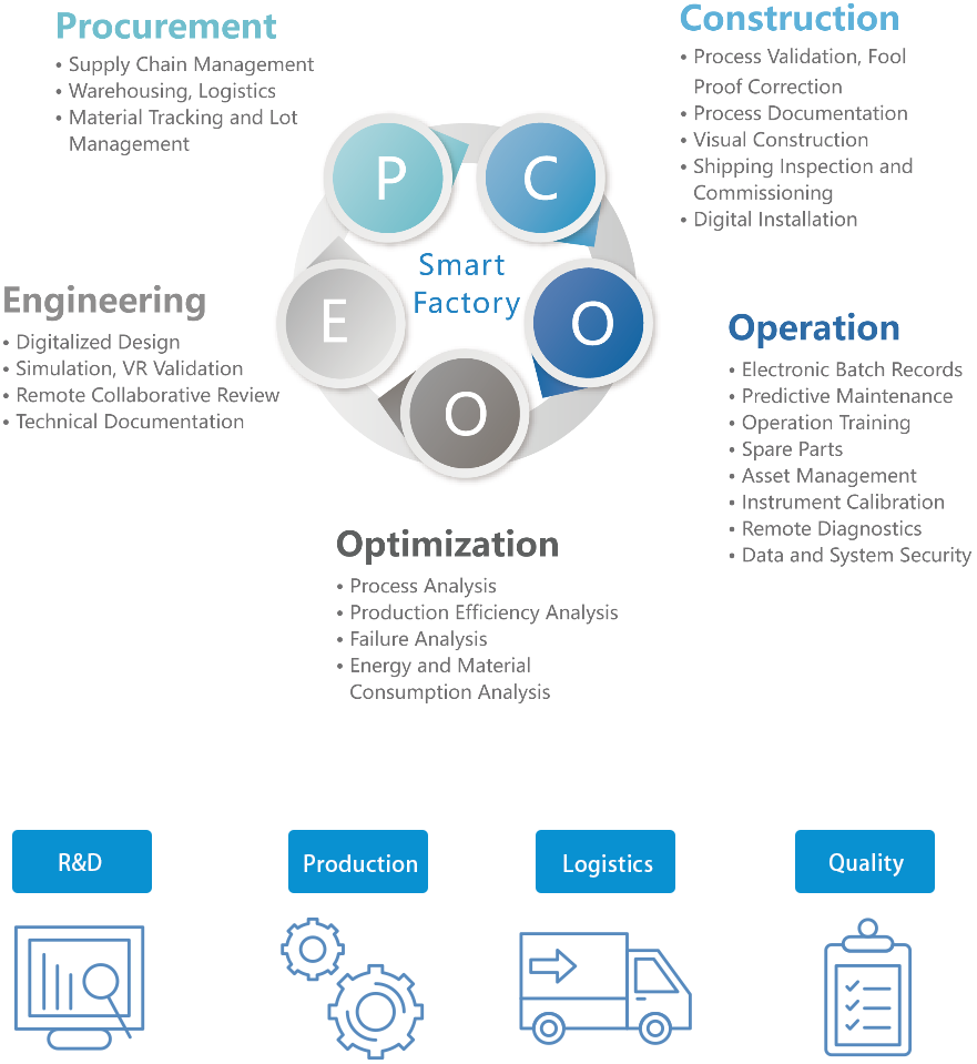Morimatsu takes the lead in implementing the concept of "digitalized service" in the industry by relying on its expertise in process production, validation system, and overall engineering solutions in the biopharmaceutic industry. Morimatsu co-builds "digitalized facility" with its customers and provides full life cycle, digitalized services including schematic design, project delivery, post-operation, and maintenance. Based on our customer needs, we provide digitalized applications and services with Morimatsu features.