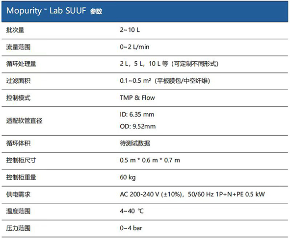 一次性超滤系统可满足20-2000L+工艺处理规模,涵盖从小试-中试-商业化生产等不同级别使用,随设备配备压力、流量、温度、电导率、UV等传感器在线显示与反馈调节,总过滤面积0.1-0.5㎡。
